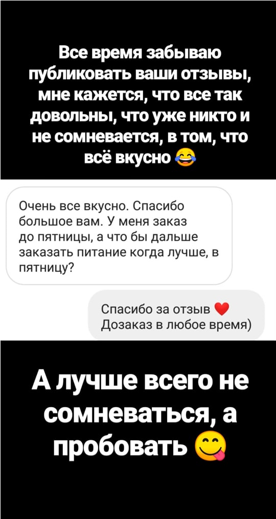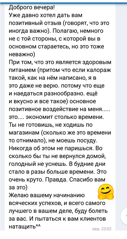 заявка принимается до 20:00 за день до доставки: ВНИМАНИЕ заявку на заказ принимаем до 20:00 до дня доставки. Если вы 1-го числа сделали заказ, еда приедет 2-го на 3-е!